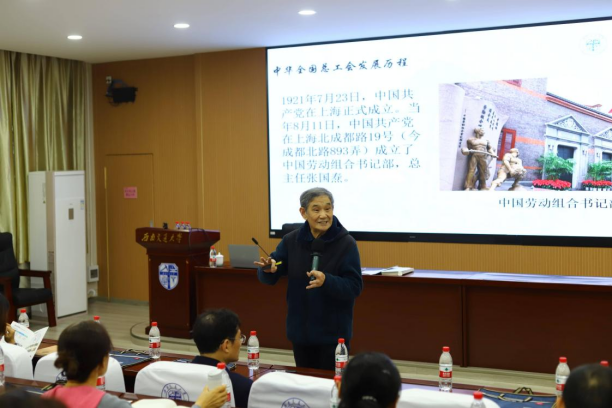 开班仪式后,学校校史专家梁锦唐老师讲授了题为“中国共产党领导下的工会发展史和学校工会发展历程”的主题报告,并带领学员再次深入学习领会了习近平总书记在庆祝中华全国总工会成立100周年暨全国劳动模范和先进工作者表彰大会上的讲话精神内涵。作为生在交大、长在交大、工作在交大的老一代交大人,梁锦唐老师对学校工会的发展历史如数家珍,他在授课中流露出对学校的深切情感让学员们感动不已。