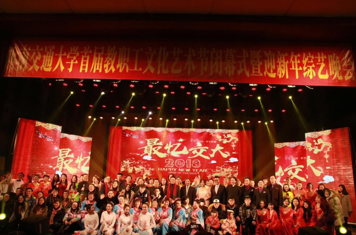 冬去春来辞旧岁,交大学子迎新年;放眼华夏齐欢聚。师生欢度夜不眠。2017年12月28日晚7点30分,由西南交通大学工会主办的首届教职工文化艺术节闭幕式·暨迎新年综艺晚会在九里校区大学生会堂举行。省总工会党组成员,副主席苗勇,省教科文卫工会主席李长春,省总工会基层工作部部长范会军,校党委书记王顺洪教授,校党委副书记、校长教授徐飞,党委副书记晏启鹏,副校长朱健梅、蒲云、张文桂、冯晓云,总会计师张兵,党委常委沈火明,校长助理王晓茹,校工会主席阎开印以及学校相关单位负责人,千余名交大新一辈、老一辈教职工和交大学子共赏文化盛宴。