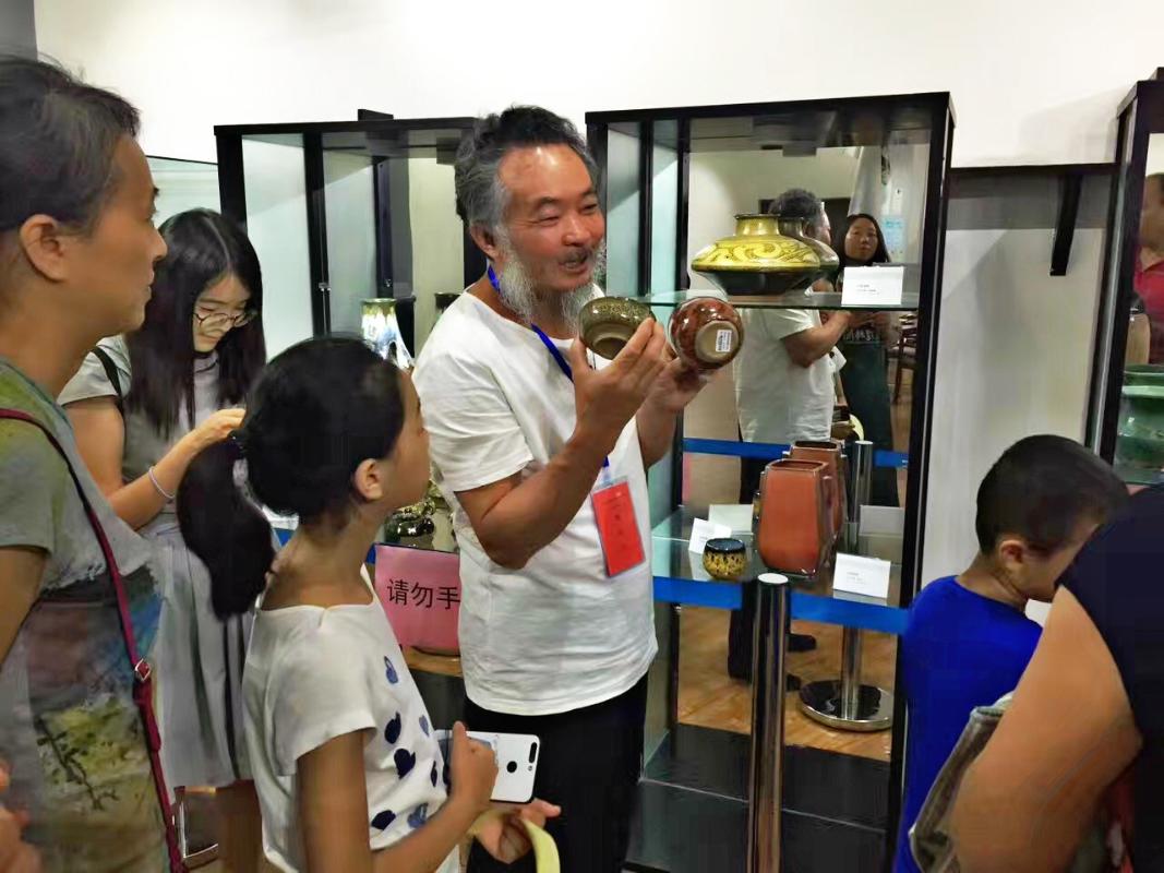 在四川会理绿陶非遗传承人韩进富老师的引领下,小朋友和家长们一起参观了会理绿陶的展厅,了解了这门传统工艺的起源、制作流程、发展历史和工艺创新,还特意为大家讲解了此次为“非遗进校园”活动创作的作品《詹天佑》的制作过程和突破。小朋友们被一个个精致的陶瓷艺术品所吸引,家长们也惊叹于会理陶瓷制作工艺的精湛。